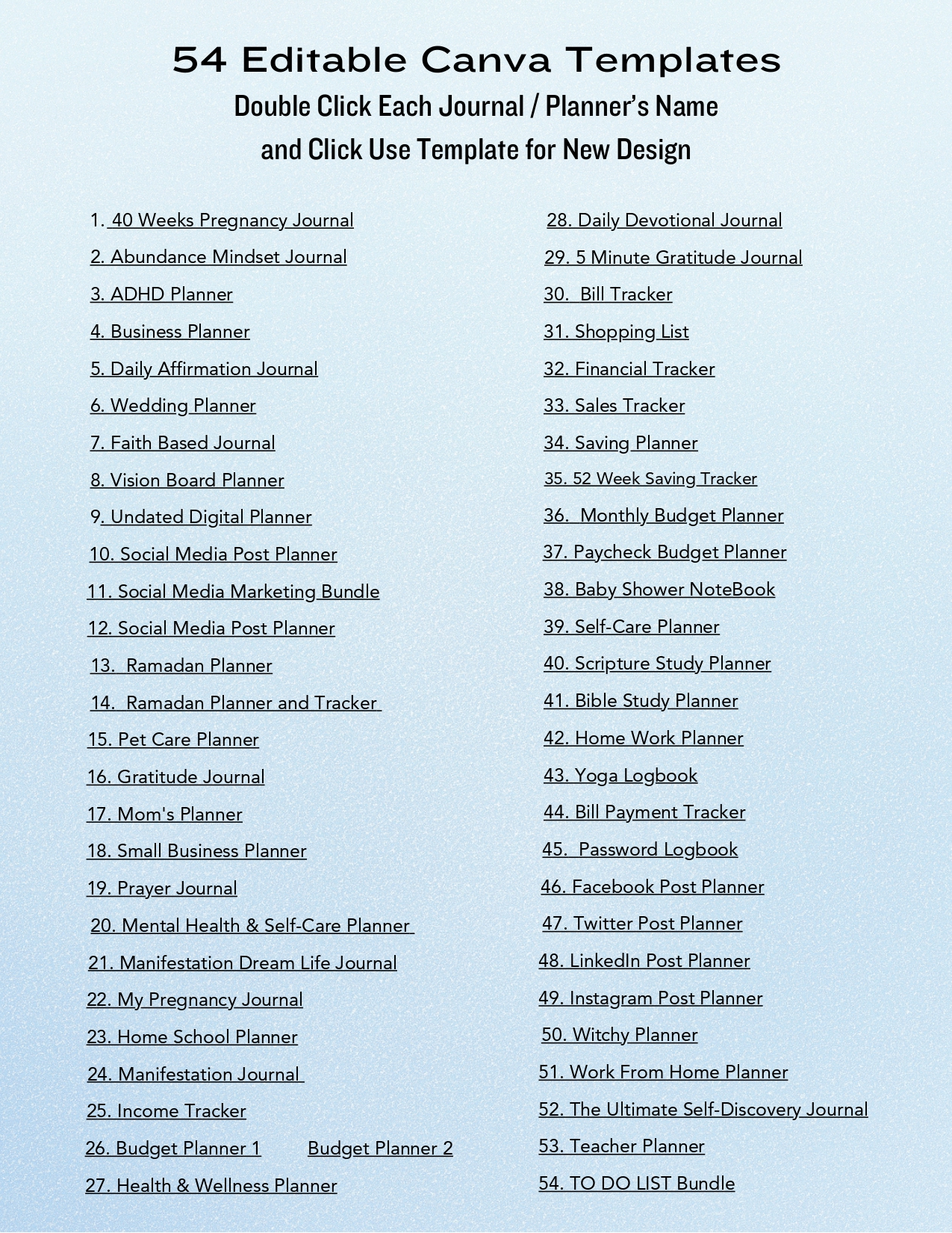 • 54 Fully Editable Canva Templates: Professionally designed layouts that you can customize in minutesβ€”no design skills required! πŸŽ¨πŸ› οΈ